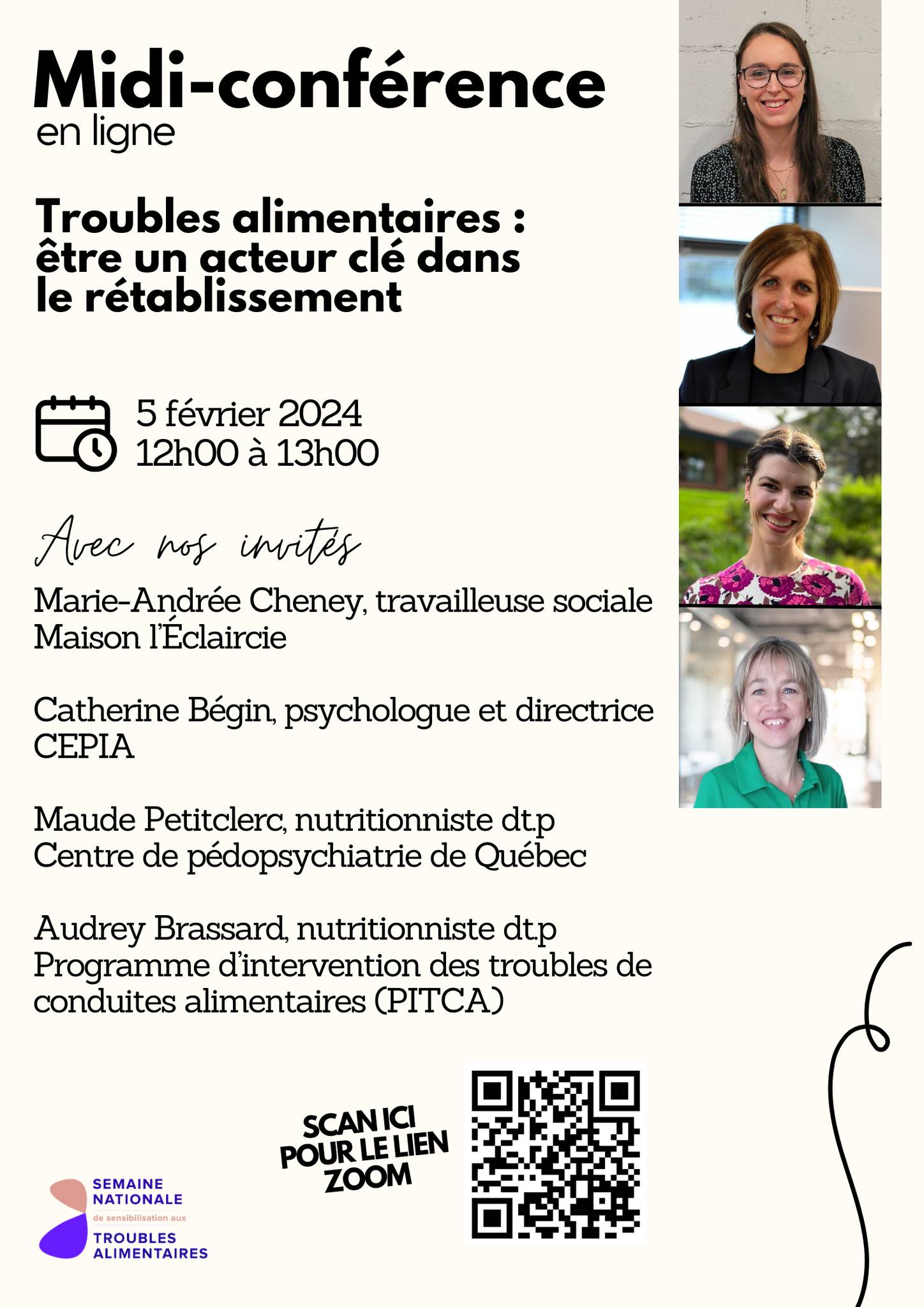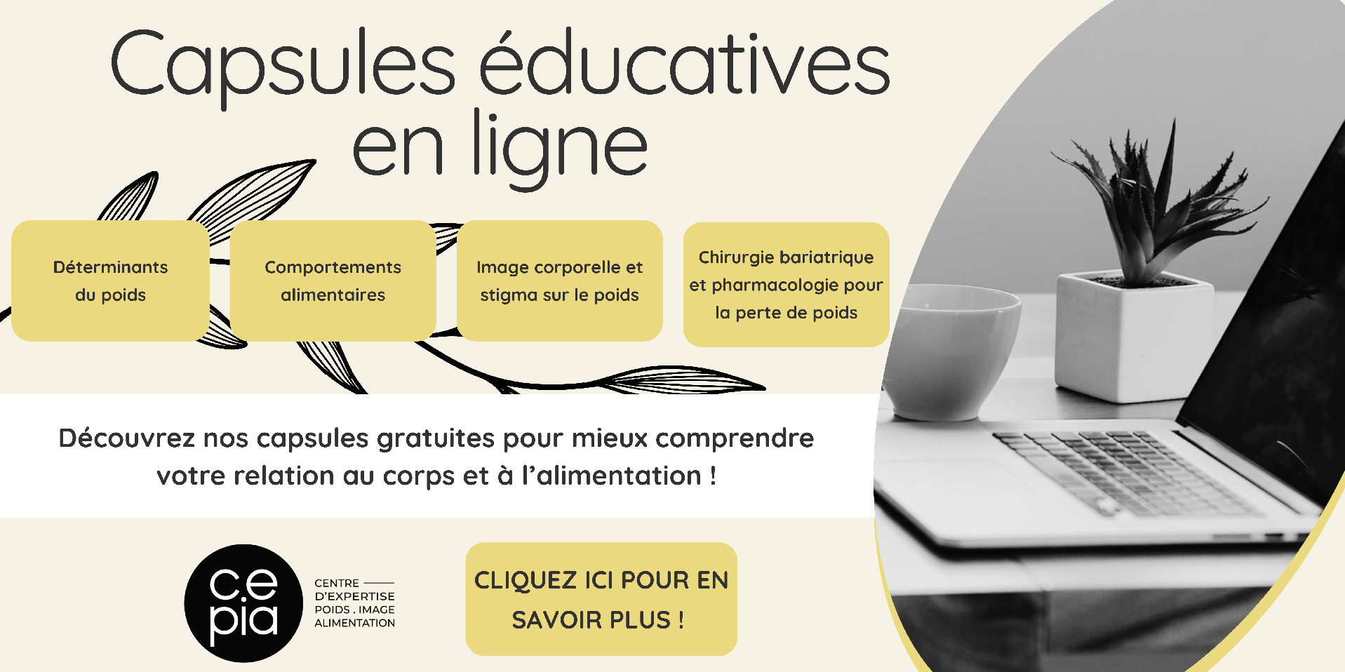 ![]() | LANCEMENT D'UNE NOUVELLE RESSOURCE POUR LES JEUNES Le site Web compulsionalimentaire.ca est maintenant en ligne. Découvrez-le et partagez cette plateforme d'information, d'autodiagnostic et d'aide professionnelle ! Catherine Bégin, directrice du CEPIA, et Josée Lavigne, responsable du volet Éducation et prévention chez ANEB-Québec, ont présenté les services disponibles pour les jeunes lors d'une conférence en ligne. Vous avez manqué la conférence ? Visionnez son enregistrement en cliquant sur ce lien ou accédez au PowerPoint de la présentation. |